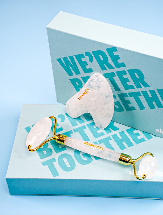 SKINSECRET Roller + Heart Kit Clear Quartz, den perfekte startpakken hvis du ønsker å begynne med ansiktsmassasje. Settet inneholder en luksuriøs ansiktsrulle og en liten versjon av gua sha-stein.
